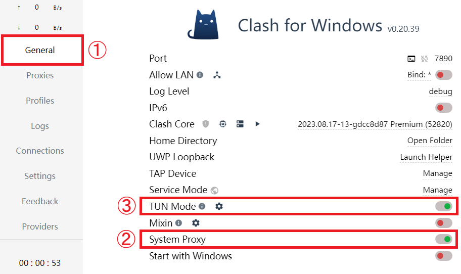 • それでも接続できなければ、「TUN Mode」をOnにする(画像③)