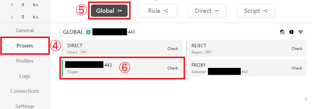 • それでも接続できなければ、左側の「Proxies」を選択し(画像④)、上の「Global」を選択し(画像⑤)、「Trojan」と書かれた項目を選択する(画像⑥)(※RuleとGlobalの違いについて