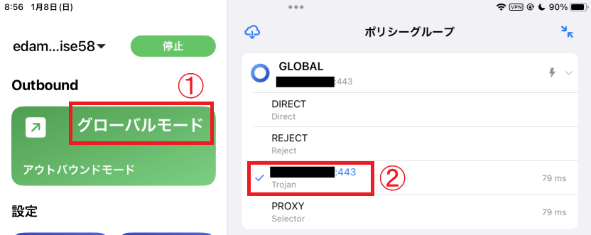 「ルールモード」と書かれた青い部分を押すと、緑色の「グローバルモード」に切り替わります(画像①)。「グローバルモード」の場合、必ず「Trojan」と書かれた項目を選択してください(画像②)。(※ルールモードとグローバルモードの違いについて